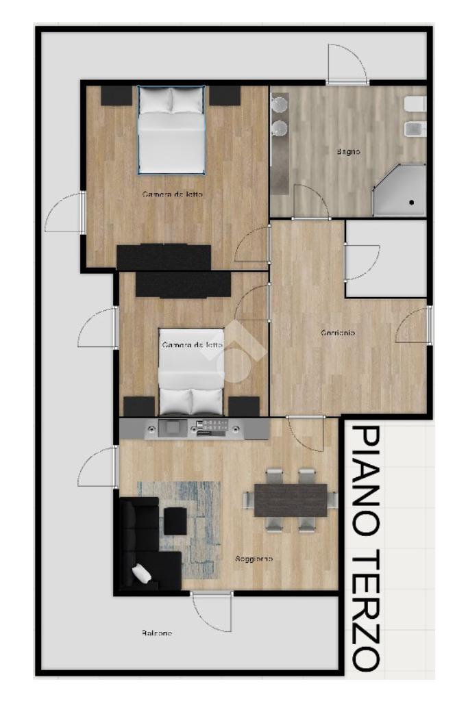 La zona notte comprende due camere da letto matrimoniali, entrambe con uscita sul balcone che abbraccia l’intero appartamento, garantendo aerazione e luce naturale in ogni ambiente.