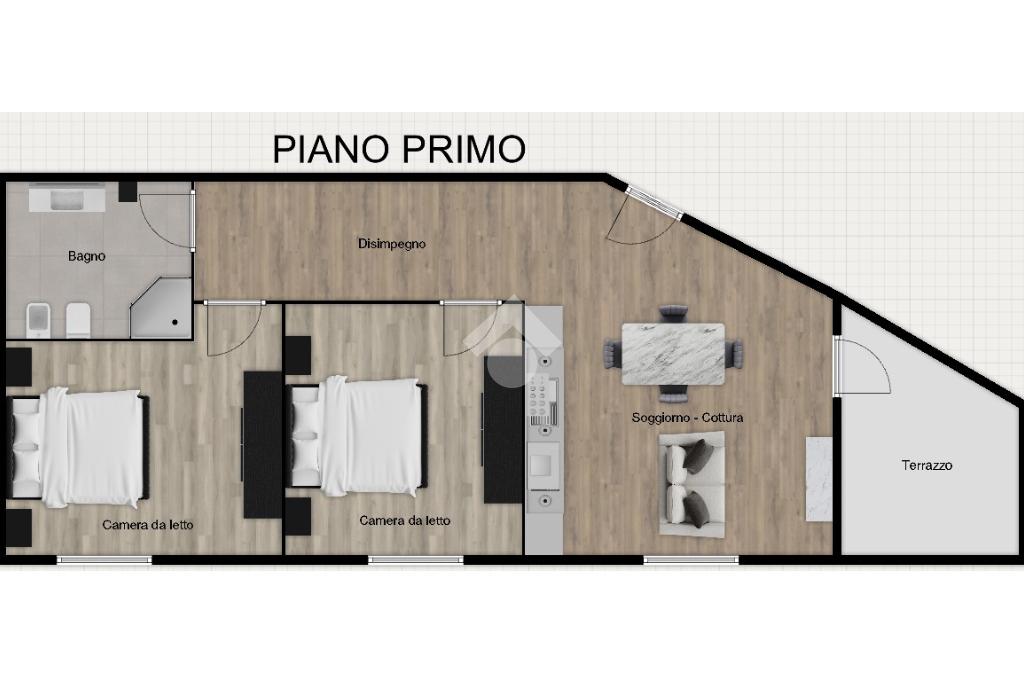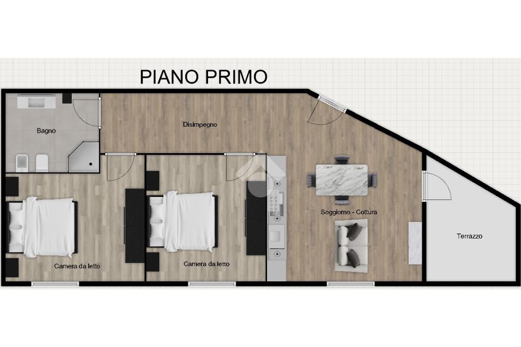 Situato al primo piano, si apre su una luminosa zona giorno con soggiorno e angolo cottura, con accesso diretto al terrazzo di generosa metratura, ideale per pranzi all’aperto e momenti di relax.