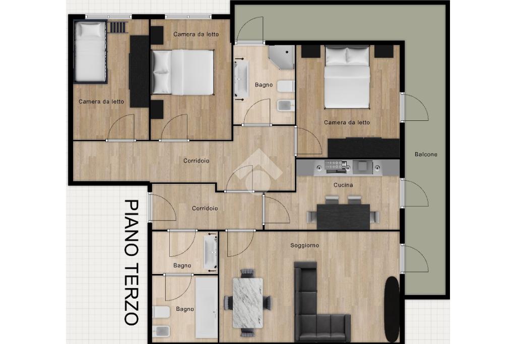 La zona notte comprende una camera matrimoniale con accesso diretto al terrazzo, in continuità con la zona giorno, un secondo bagno finestrato con box doccia, due ulteriori camere da letto e un pratico ripostiglio.