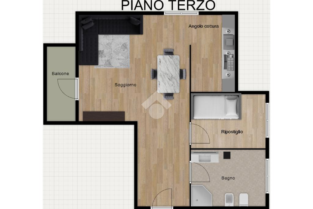 L’appartamento è situato al terzo e ultimo piano dello stabile. L’ingresso conduce alla zona giorno con angolo cottura, luminosa e ben organizzata, con accesso a un balconcino.