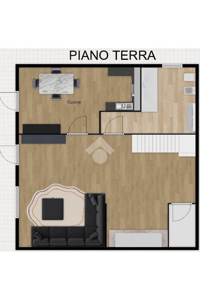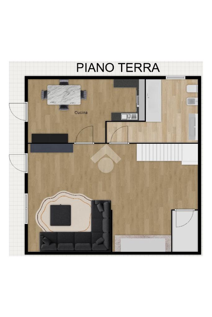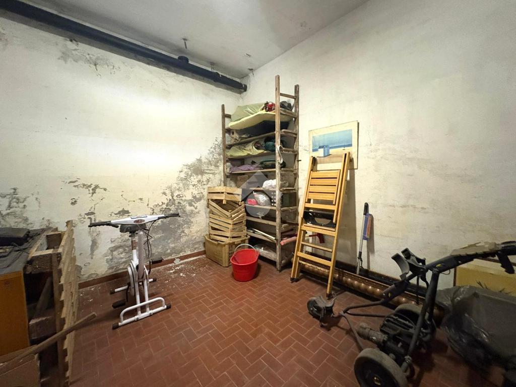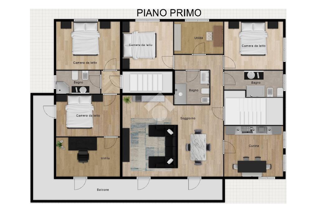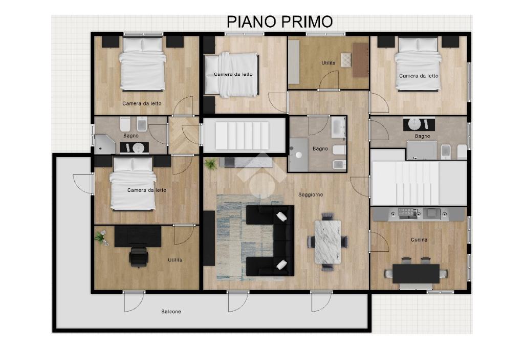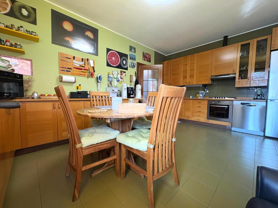 Al primo piano si trova un trilocale luminoso con spaziosa zona giorno, soggiorno, cucina abitabile con balcone, due camere matrimoniali, studio e due bagni, uno finestrato e uno con aerazione forzata.
